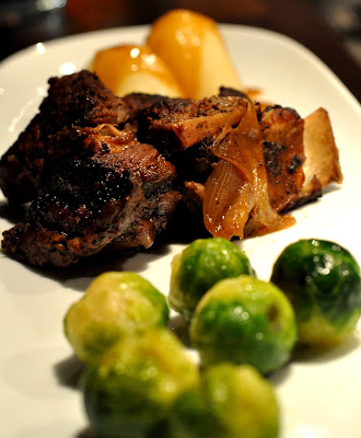 Servera revbenen med kokt potatis, brysselkål, syltlök och den ljuvliga såsen.